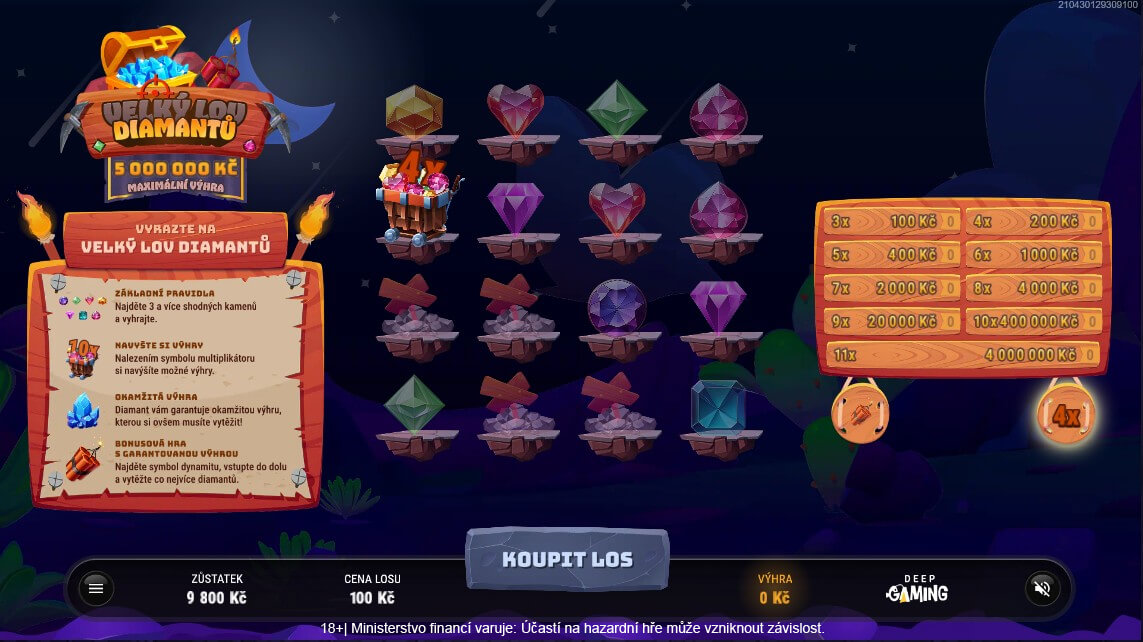 Stírací los Velký Lov diamantů vás zavede do noční pouště, kde se ukrývají drahé kameny a diamanty. S pomocí dynamitu se můžete dostat do dolu a vytěžit ještě větší výhry. Kromě toho na vás čeká hlavní výhra až 5 000 000 Kč.